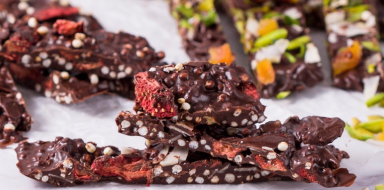 Jártatok már úgy, hogy valami különleges édességre vágytatok, aminek nem bonyolult az elkészítése, és még a sütőt se kell hozzá bekapcsolni? A vésztartalék étcsokin, aszalt gyümölcsön és magokon kívül azonban nincs semmi otthon. Hát, velem ez történt, és mivel nem volt kedvem bevásárlókörútra indulni, ezért úgy döntöttem, hogy elkészítem az én egyedi ízvilágú csokoládéfalatkáimat, amiknek a receptjét most megosztom veletek. Az epres-mandulás csokifalatka roppanós és kellemesen gyümölcsös, a pisztáciás-sárgabarackos falatka pedig igazán zamatos, telt ízű, egyedi édesség lett. Mondanom sem kell, hogy pillanatok alatt elfogyott, így másnap már nem úszhattam meg a bevásárlást.