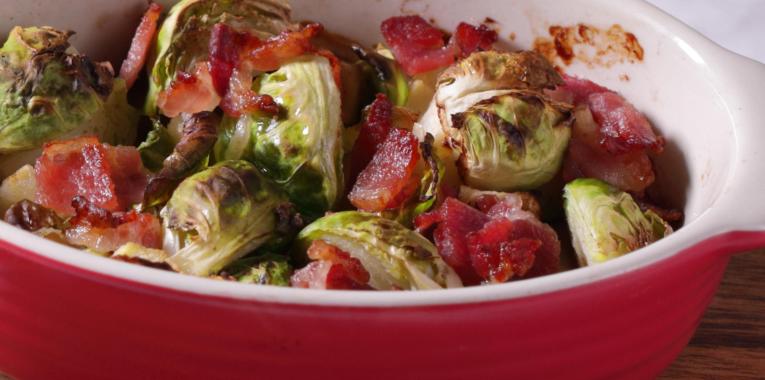 A tűzálló tálba tesszük a kelbimbót, az almát és a bacont, megszórjuk a római köménnyel és sóval, majd jól összeforgatjuk.